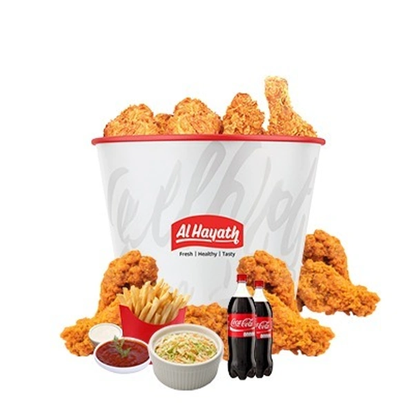 14pcs Fried Chicken, 4pcs Garlic Paste, 1pcs Coleslaw, 4pcs bun,12 ketchup ,French fries 100gm,Softdrinks 1ltr